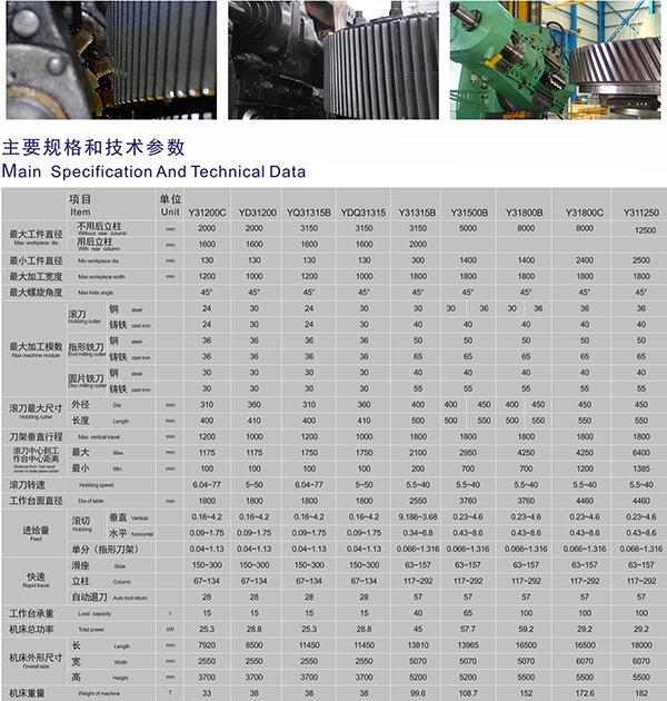 Y31系列機床適于加工直齒圓柱齒輪、斜齒圓柱齒輪、蝸輪等。使用指形銑刀配合反向機構可以加工無空刀槽的人字齒輪,使用后立柱可加工軸齒輪。